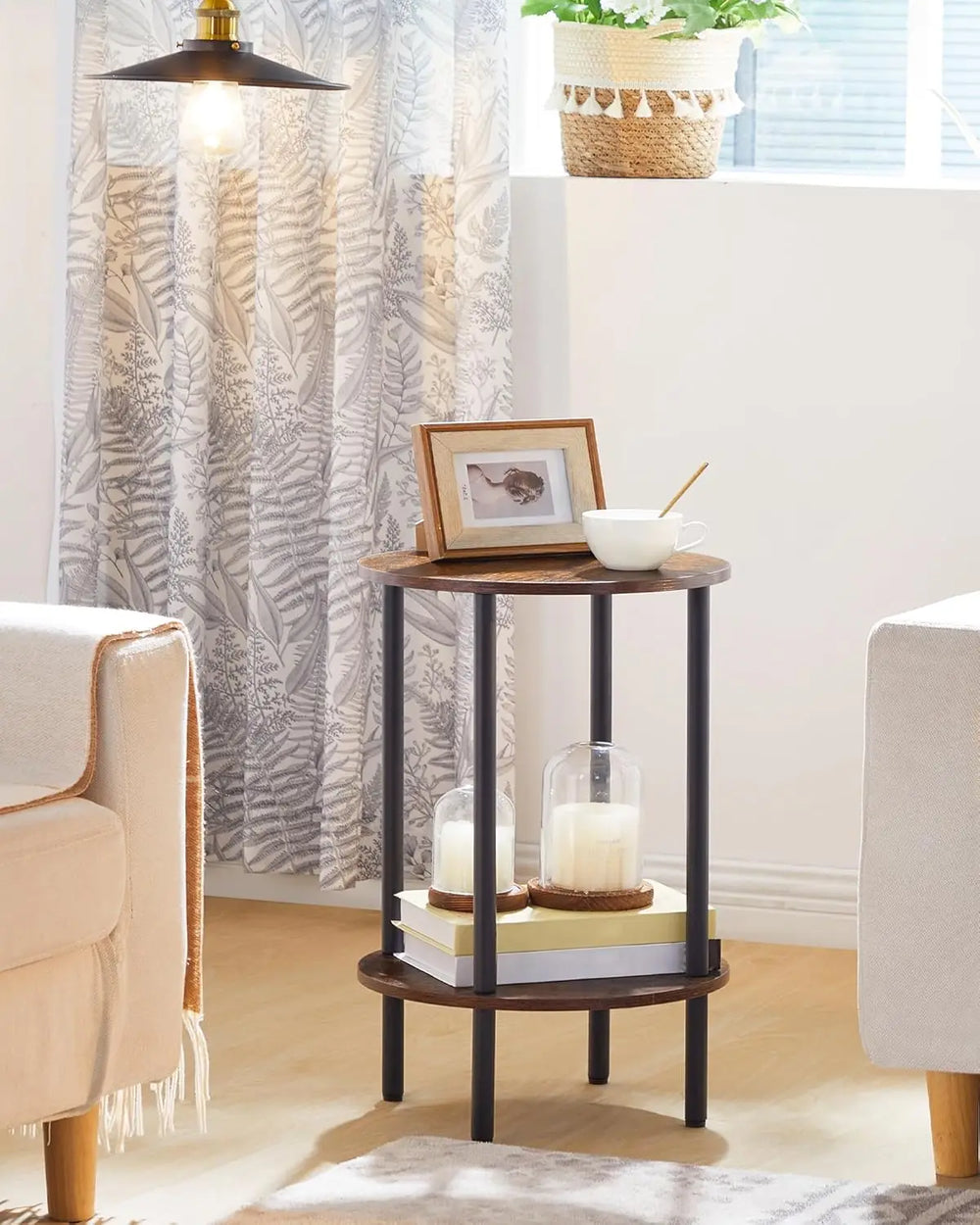 Bring vintage character and practical storage together with this compact piece styled like an antique 2 tier round table. The rustic brown top paired with a sturdy black frame delivers the warmth of rustic wood end tables while maintaining modern durability. Its circular design softens room layouts and functions beautifully as a rustic round side table beside sofas or armchairs. The added lower shelf keeps books, remotes, or décor neatly organized, making it a versatile decor end table that enhances both convenience and visual appeal in cozy living spaces.