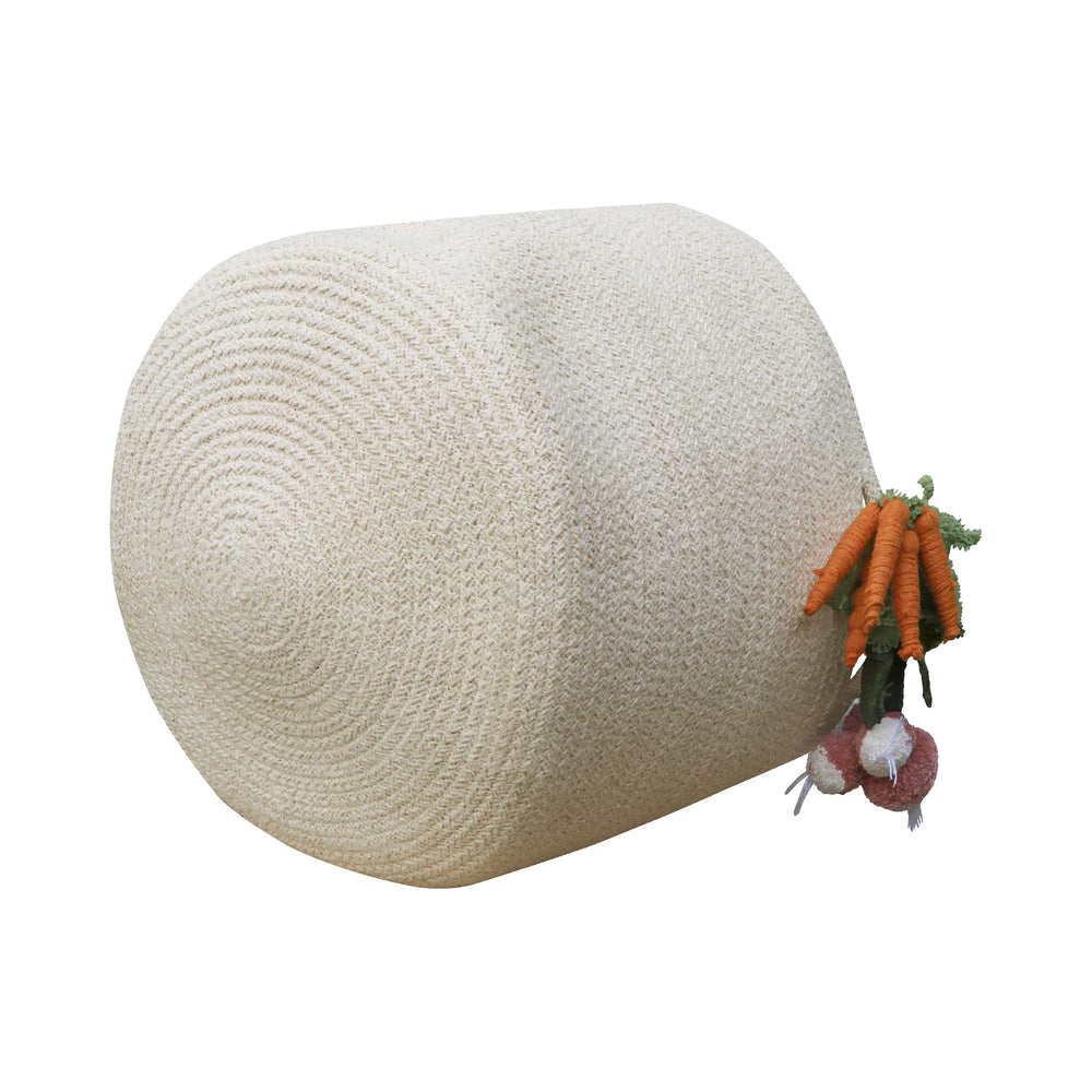 Hand-braided cotton cords and stuffed veggie accents create a playful storage piece that doubles as decor. Eco-friendly natural cotton and non-toxic dyes keep it safe for kids, plants, and everyday use. Dual side handles and a flexible weave make moving and tucking it away effortless. Handmade in India with ISO-certified quality for durable, charming organization.