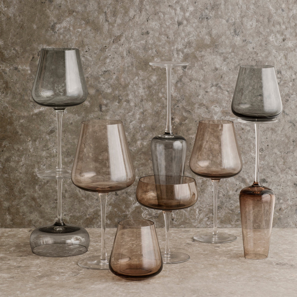 Crafted with precision, these hand blown colored wine glasses feature subtle smoky gray or warm coffee hues, making every pour a visual delight. Tiny bubbles and flow lines in the glass create a unique, artisanal conversation piece for your tabletop.