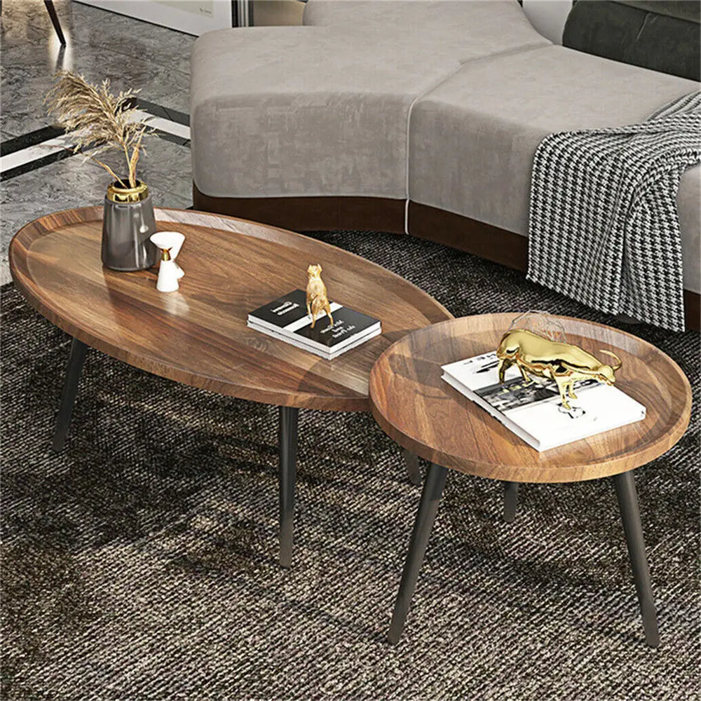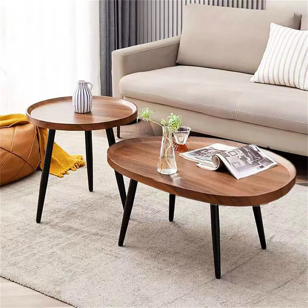 Walnut Oval Irregular Coffee Table Set with Triangle Legs