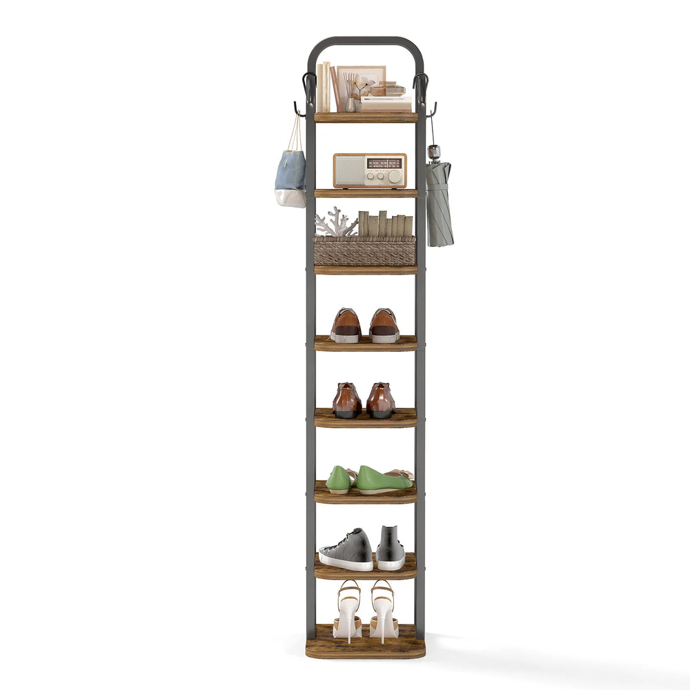 8 Tier Vertical Shoe Rack – Tall Narrow Organizer with Hooks